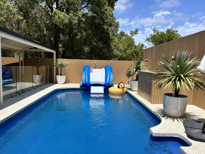 After transforming their back fence into a striking feature wall using NewTechWood Castellation Cladding, our clients returned to extend the look along their adjacent boundary fence. The goal this time around was to create a cohesive finish to the backyard, framing the pool and the massive 19-meter length of their block, all the way to a custom entrance gate from the garage. It was no small task, but using NewTechWood DIY Quick Panel cladding, the project was completed in record time – and the result is spectacular.