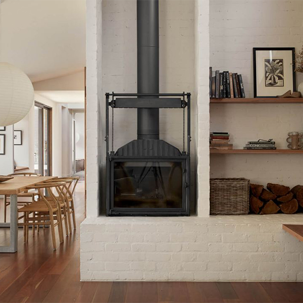 The Radiante 844 features the signature dual-opening door with its iconic counterweight mechanism allowing the door to slide up for open fire enjoyment and down for slow combustion heating efficiency. Designed for masonry surrounds, existing fireplaces, or freestanding installations, this model offers endless design options.