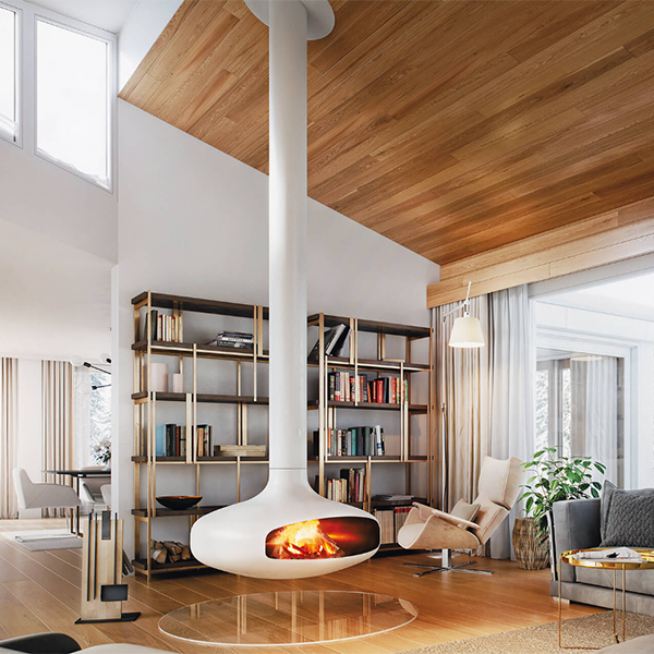 Hanging from the ceiling and designed to rotate, suspended wood fireplaces distribute heat evenly while serving as a focal point. With no bulky hearth or base required, they free up floor space and add an unmistakable sense of lightness to the room.
