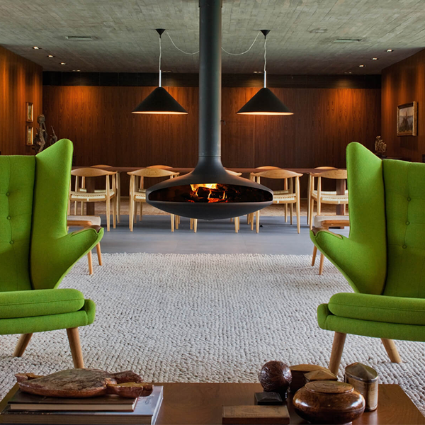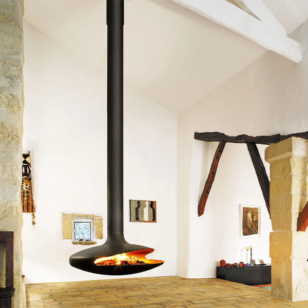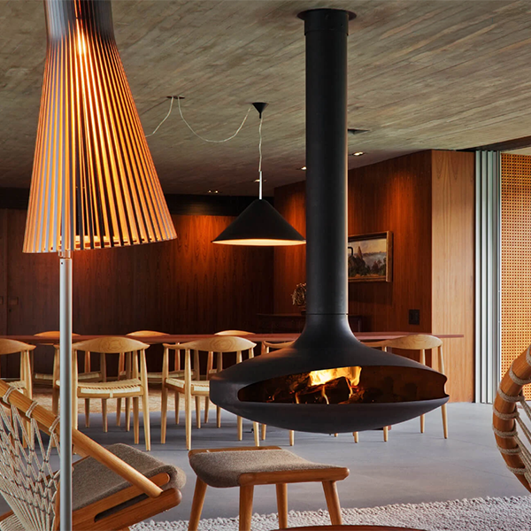 Hanging from the ceiling and designed to rotate, suspended wood fireplaces distribute heat evenly while serving as a focal point. With no bulky hearth or base required, they free up floor space and add an unmistakable sense of lightness to the room.