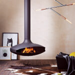 Hanging from the ceiling and designed to rotate, suspended wood fireplaces distribute heat evenly while serving as a focal point. With no bulky hearth or base required, they free up floor space and add an unmistakable sense of lightness to the room.